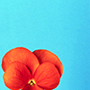 Description: an orange pansy against a bright blue background